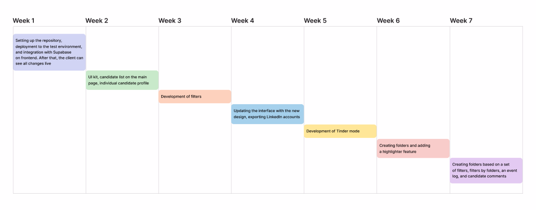 Arthur worked in weekly sprints with a planning and a demo at the beginning of each one. In one and half months the client and the developer had only seven calls. The features were being created in order of importance: main page → candidate’s profile → filters → Tinder mode → other features.