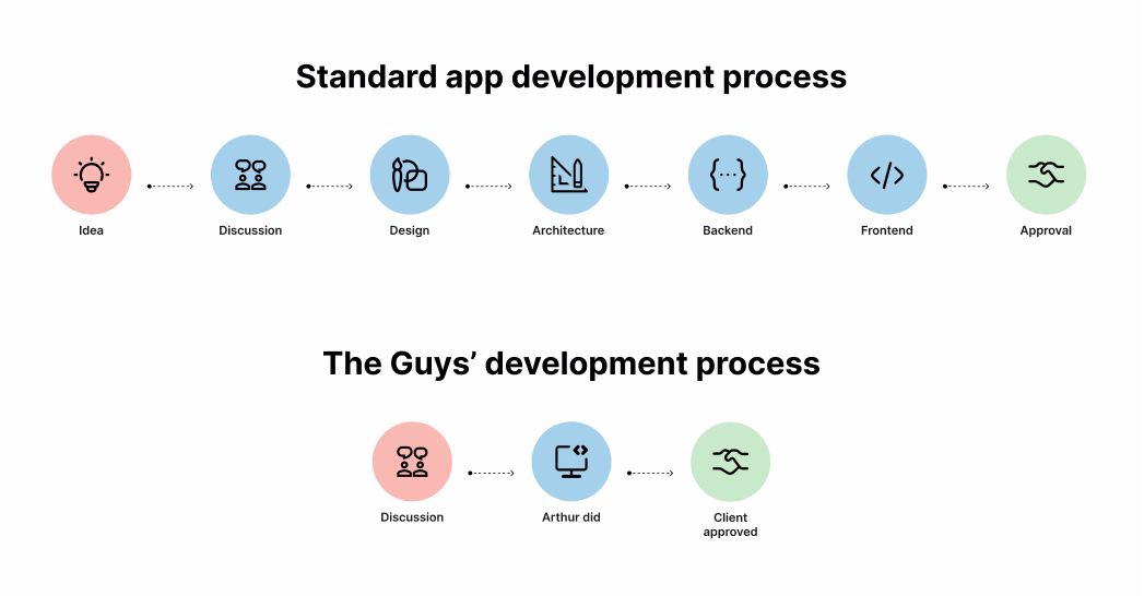 The process of developing The Guys wasn’t standard. For example, no manager was needed to talk to the client; one developer handled all the tasks independently.