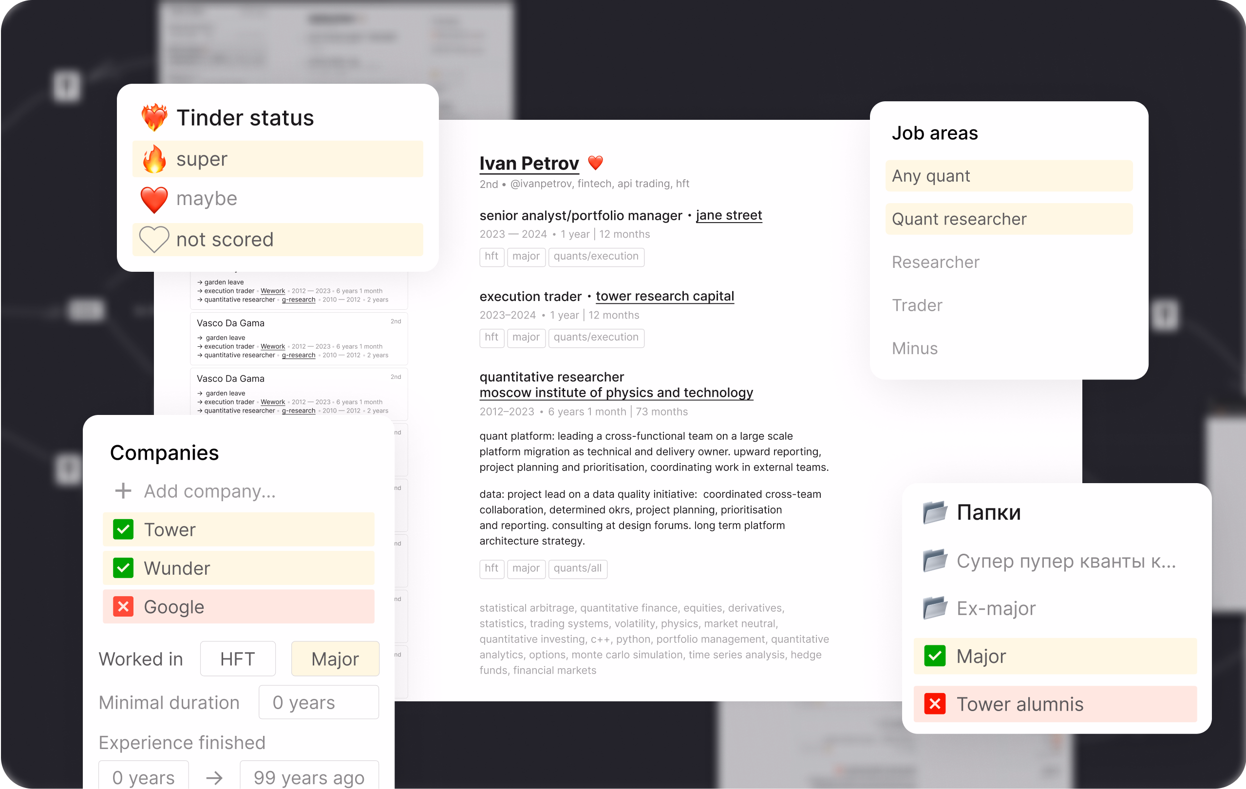 This feature allows HR specialists to estimate quants: they can like, dislike, or give a superlike to them. Developing Tinder mode, Arthur took inspiration from dating apps.